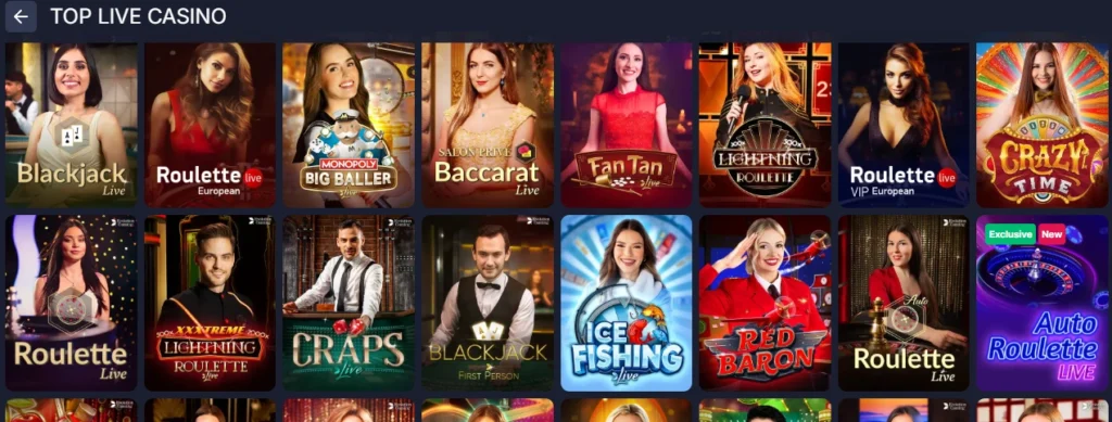 The Live Casino division is primarily powered by Evolution and Pragmatic Play Live – two of the largest studios in the industry. You will get: